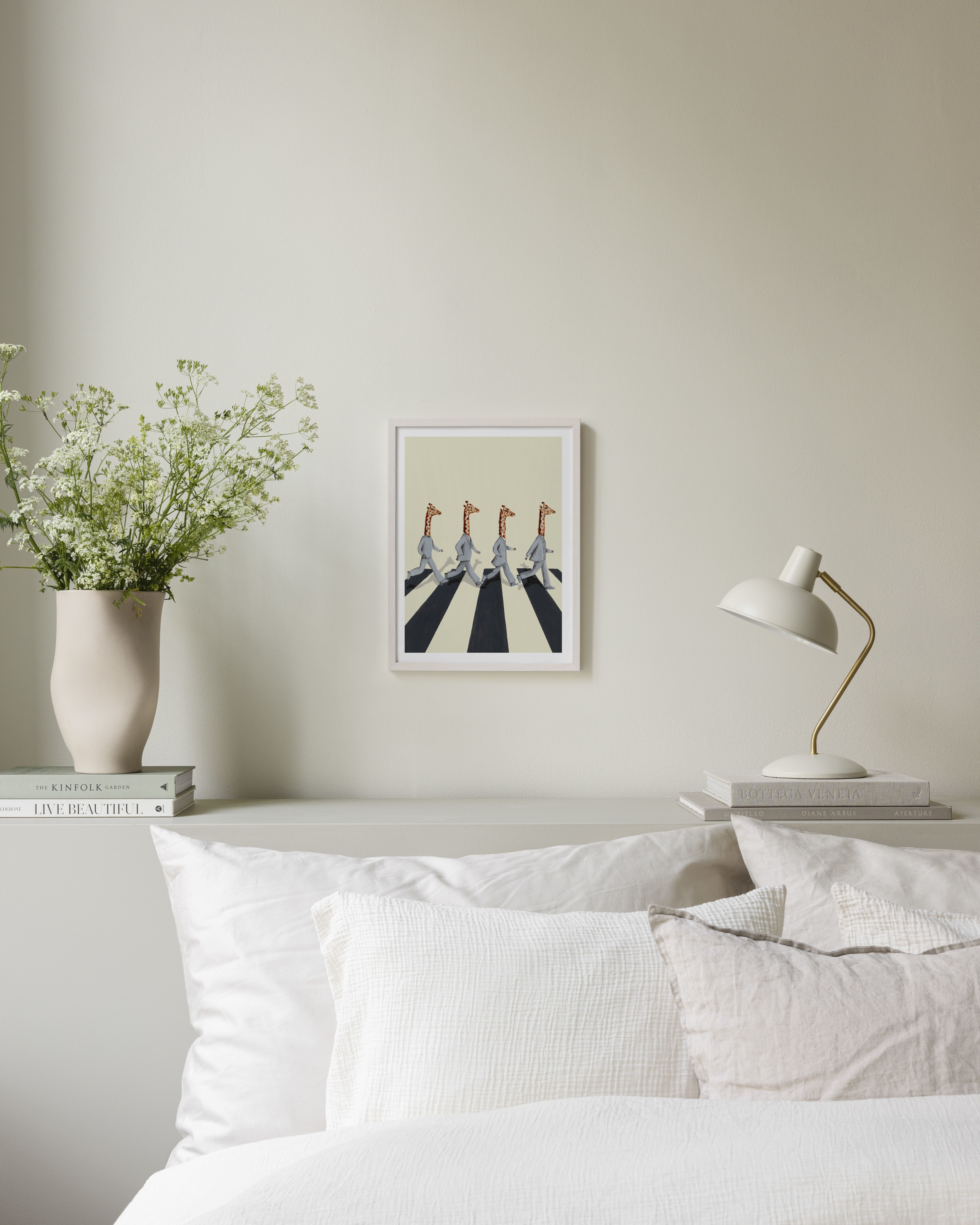 Poster surreale di quattro giraffe in abiti grigi che attraversano un passaggio pedonale su uno sfondo beige chiaro.