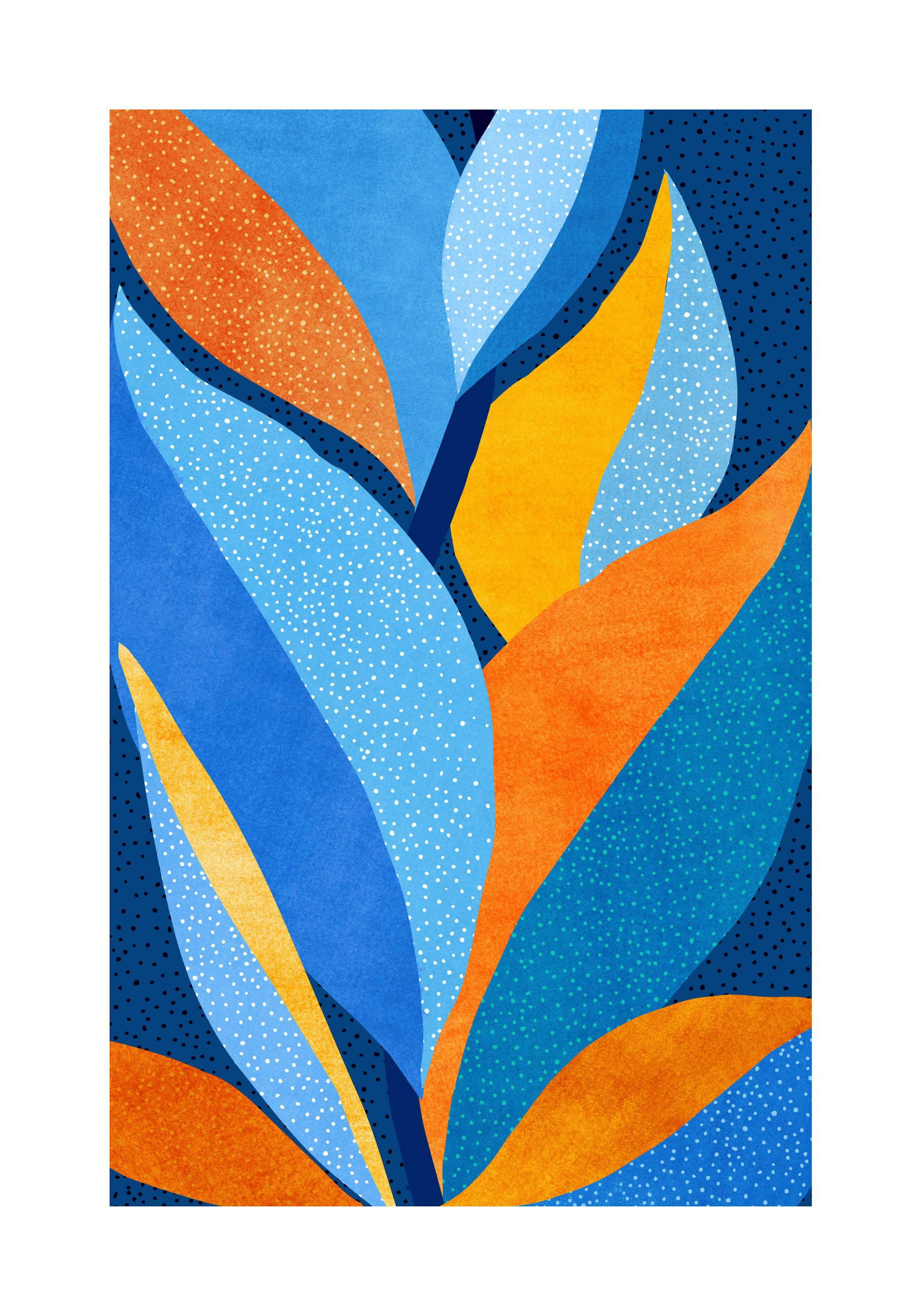 Illustrazione di una pianta in blu, arancione e giallo. Bellissimo poster con colori forti, perfetto per illuminare il soggiorno.