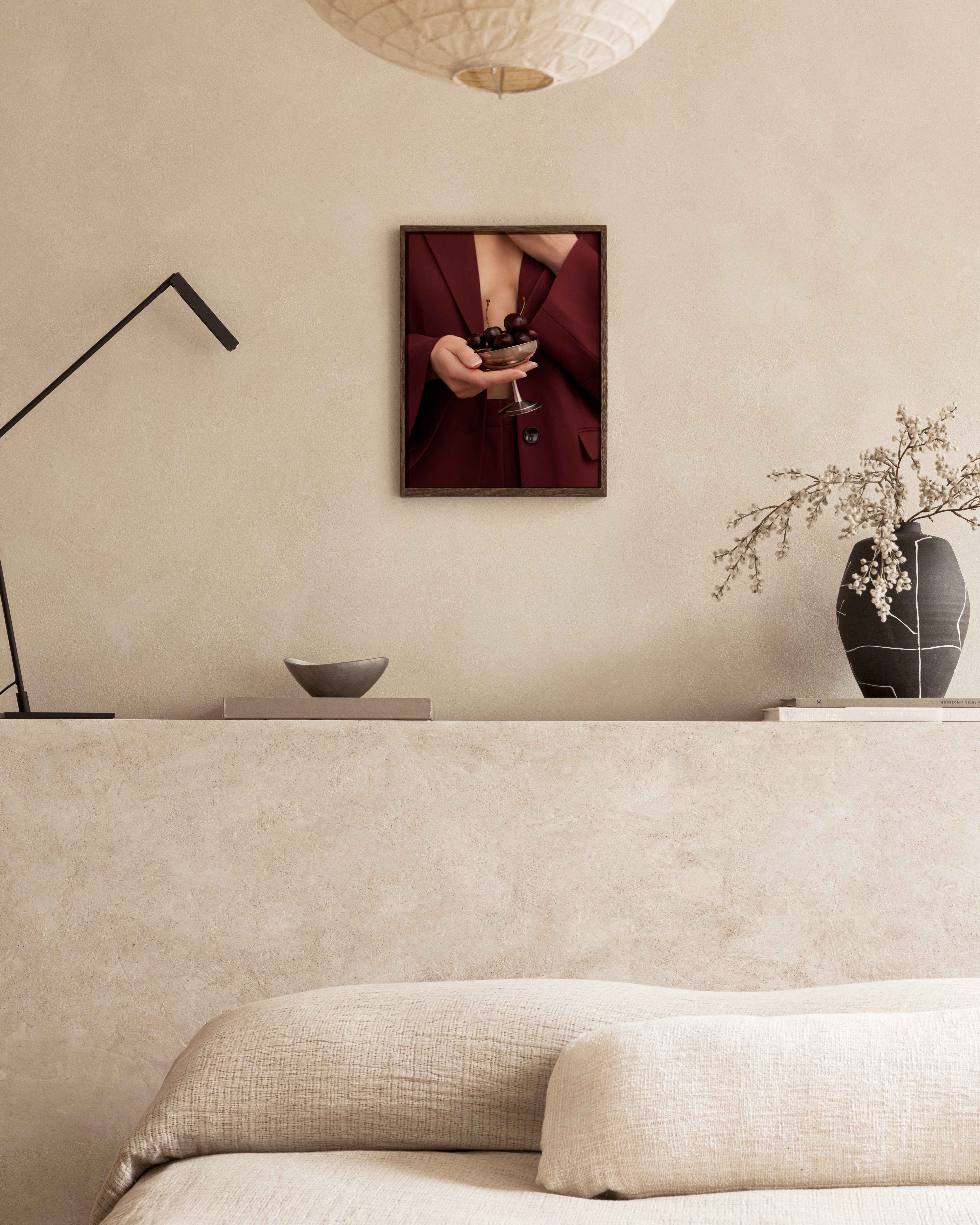 Da CHF 4.77Un poster elegante che raffigura una persona con un blazer rosso scuro che tiene una coppa argentata piena di ciliegie rosse lucide.