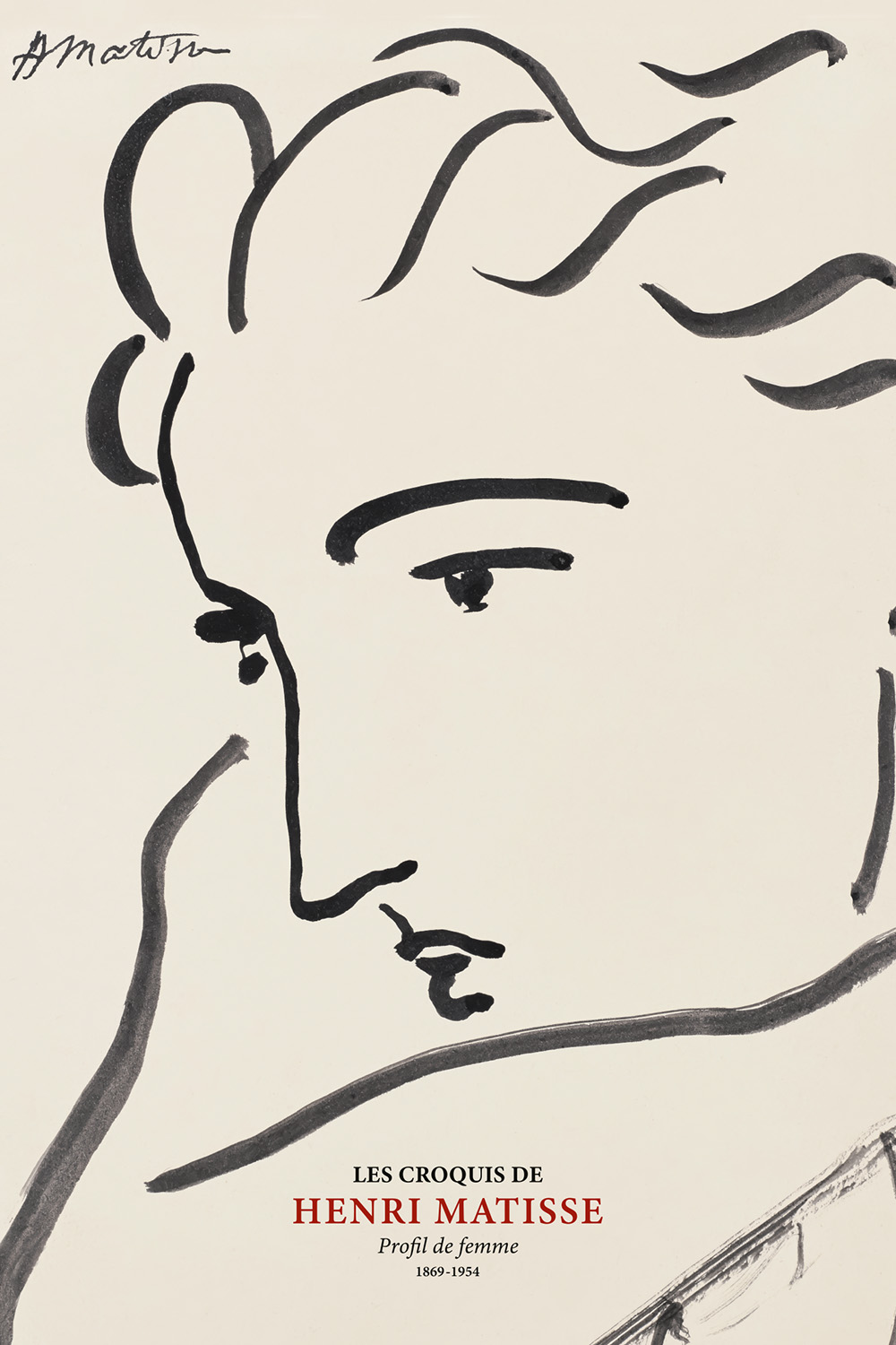 Un semplice disegno a linee nere che mostra il profilo di un volto femminile con capelli ondulati. Questo poster minimalista presenta linee fluide e scorrevoli su uno sfondo bianco con testo rosso e nero.