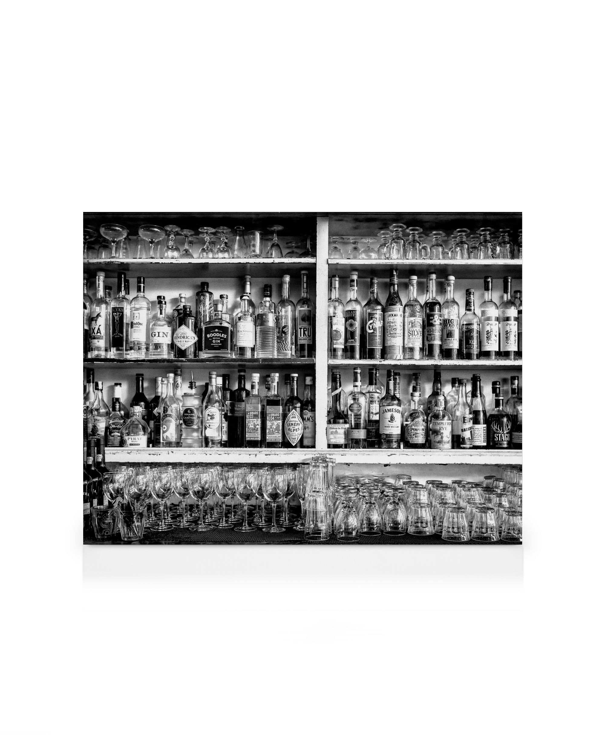 Da CHF 41.95Una coinvolgente stampa su tela in bianco e nero che mostra scaffali pieni di bottiglie di varie forme e dimensioni, con file di bicchieri capovolti sotto. Questa intrigante arte da galleria a parete aggiunge stile a qualsiasi casa.