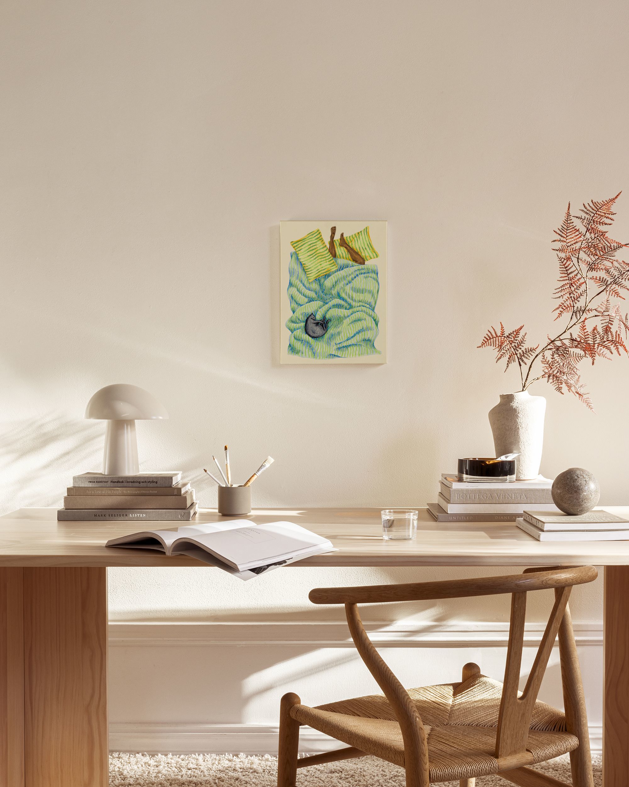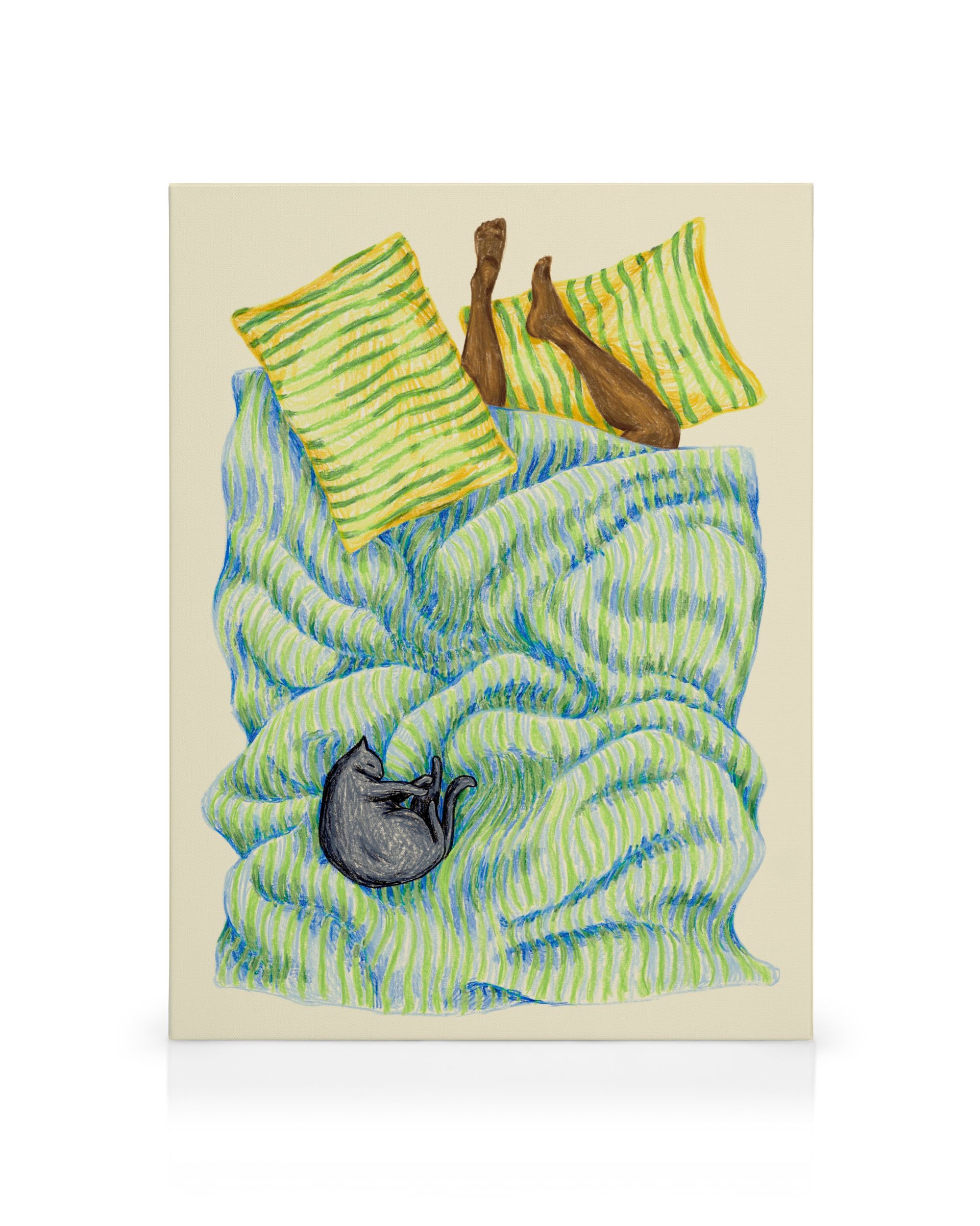Da CHF 41.95Una stampa su tela che illustra un letto accogliente con cuscini a righe e una coperta in blu, verde e giallo. Un gatto nero sta dormendo ai piedi del letto.