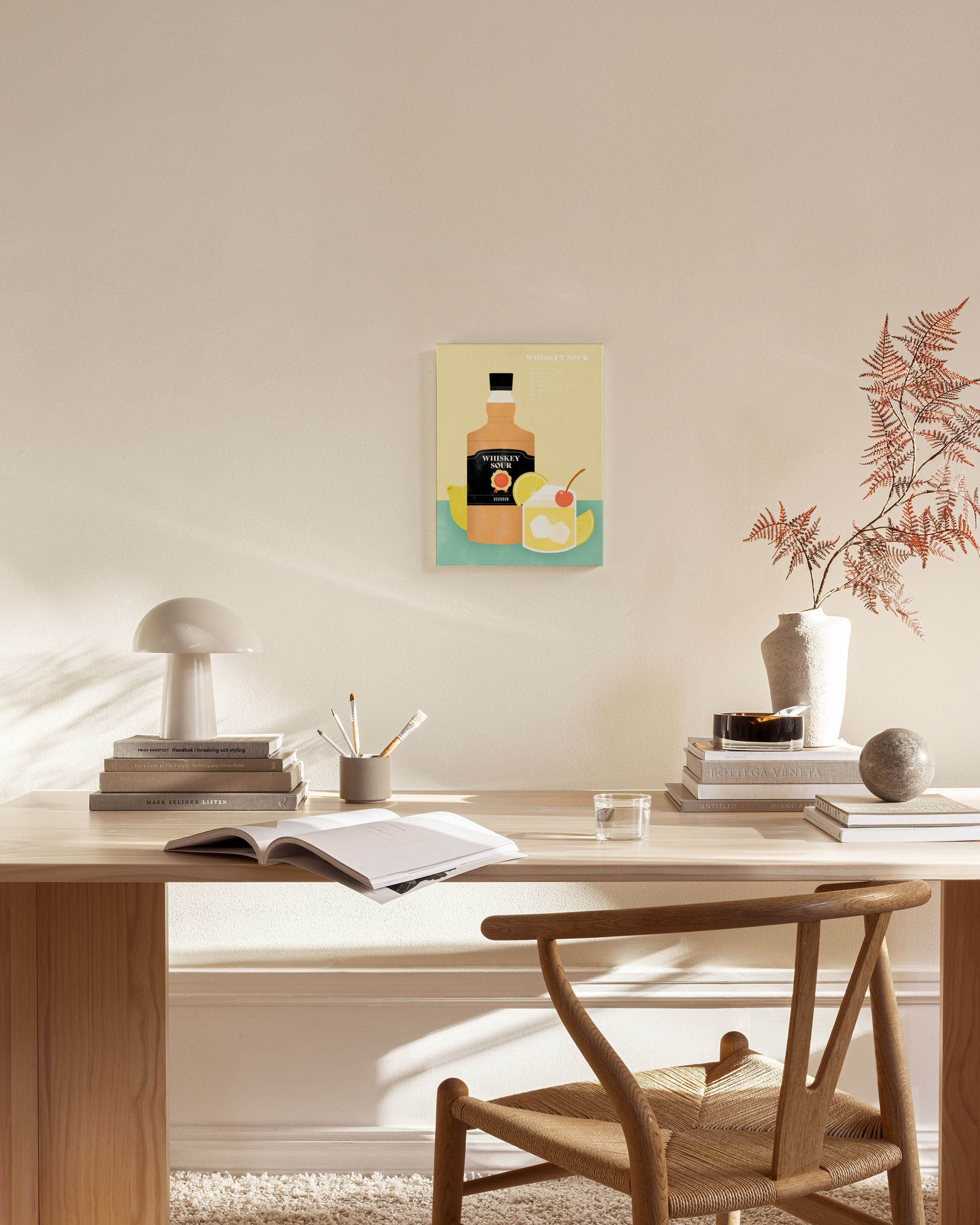 Da CHF 41.95Un'illustrazione di una ricetta del cocktail whiskey sour. Questa stampa su tela mostra una bottiglia di whiskey e un bicchiere del cocktail con ghiaccio, limone e guarnizione di ciliegia.