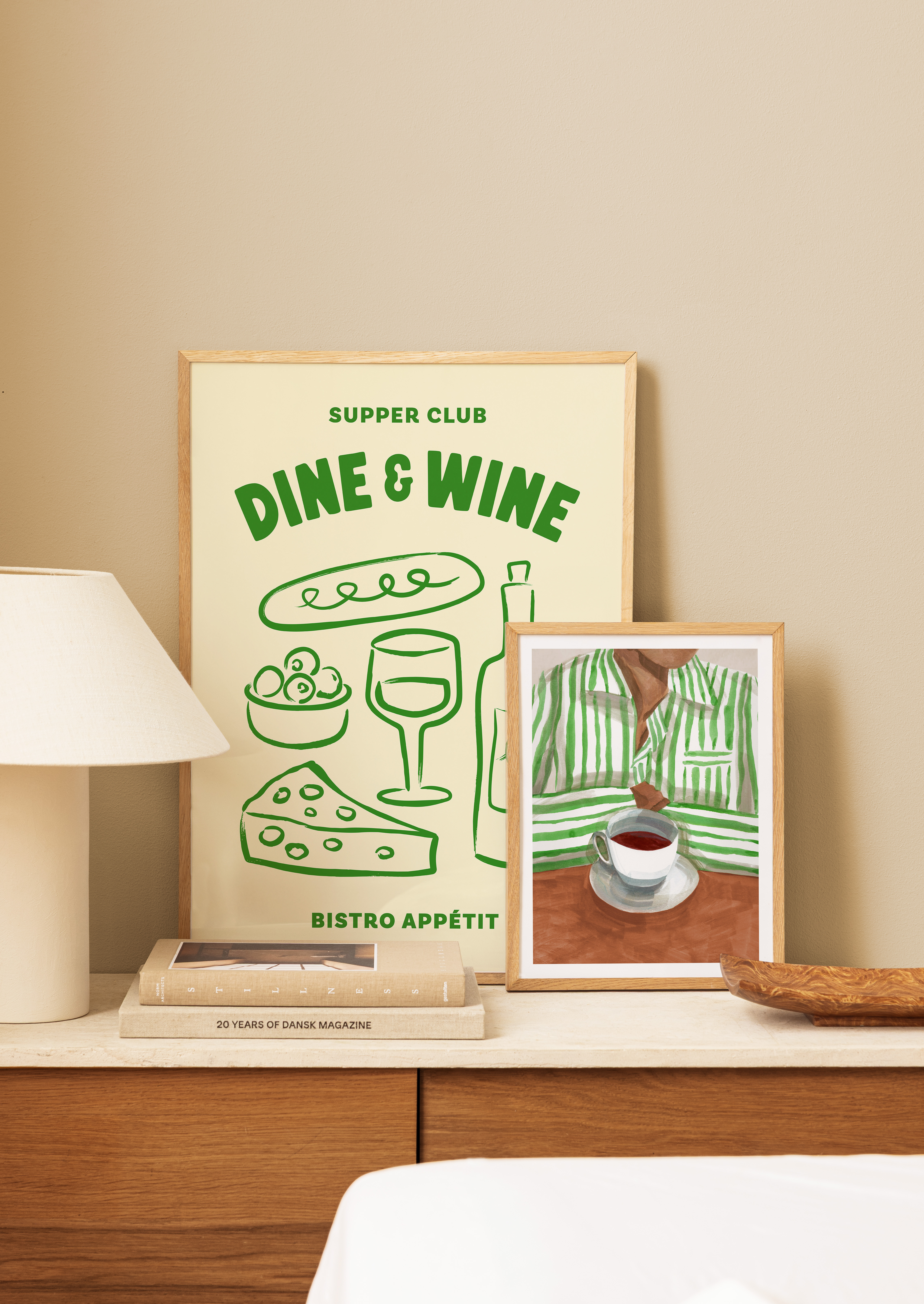 Poster einer Person in einem grün-weiß gestreiften Shirt mit einer Tasse Kaffee. Perfekte Wanddekoration für deine Küche oder dein Esszimmer.